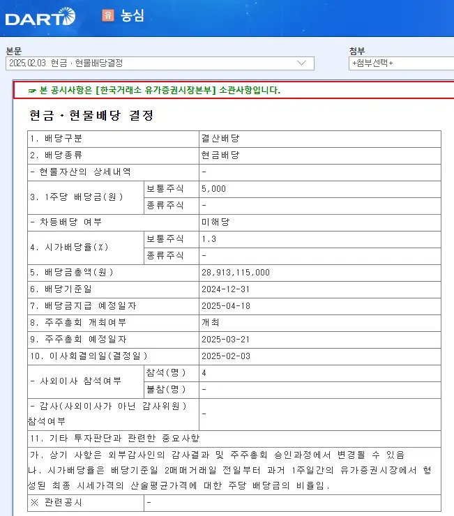🍜 농심은 2025년에도 5,000원의 배당금을 지급하며, 배당 수익률은 1.3%로 책정되었습니다.