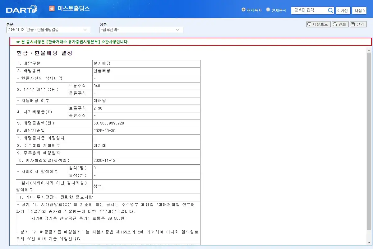 미스토홀딩스 2025년 3분기 배당 FAQ